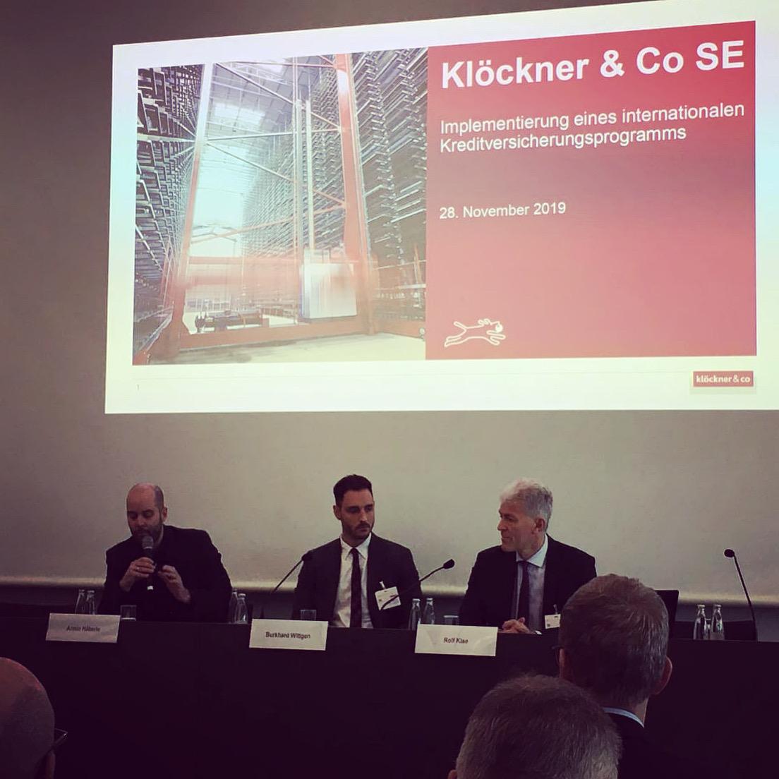On the left, Burkhard with Rolf Klee, Head of Group Treasury at Klöckner & Co SE, on the right with Matthias Beck, Head of Risk Management at Adolf Würth GmbH & Co. KG and Wibke Kuhnert, Corporate Director Finance at Henkel AG & Co. KGaA.